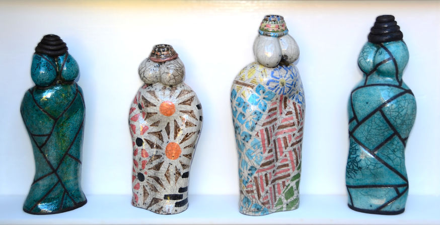 These 'sister of beauty' figures were inspired by my trip to Tanzania. A combination of slip decoration, raku and barrel firing techniques have been used. My ceramic ware is made from my studio in Elmswell, Bury St Edmunds, Suffolk.